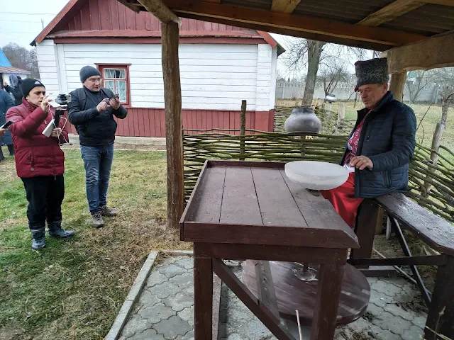 предків. Із гордістю демонструє під навісом ткацький верстат і жорна - пристрій для